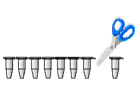 | プライマーを乾燥充填している8連結PCRチューブから必要数をはさみ等で切り取る。 | 核酸5μLとXPCR酵素5μLを加えて反応液を調製する。 | 10μL反応対応のPCR機器にセットし、PCR反応を行う。 | PCR反応後のチューブにラテックス展開液を加える。 |